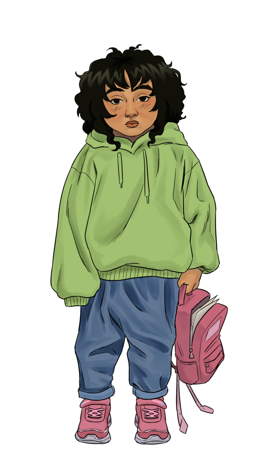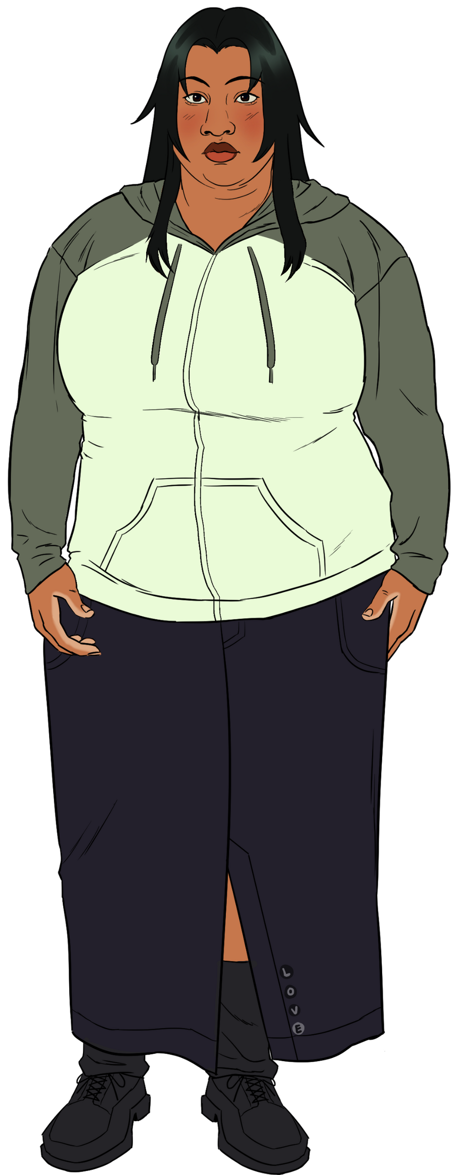 Satomi Tamashiro is an awkward and somewhat off putting person, college masters program drop out, and former shut in. Satomi is nonbinary (demigender). Given their shy and almost stoic dementor, explosive outbursts of emotion from them catch many off guard.½ Hawaiian, ¼ Okinawan, ¼ Japanese